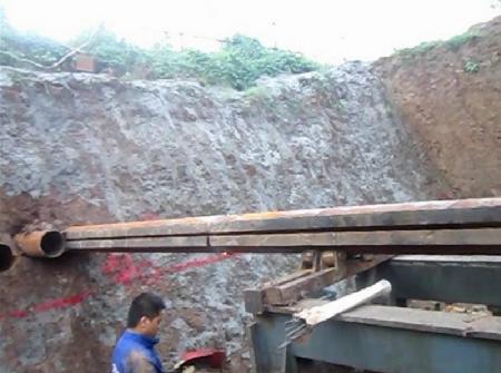 隧道所處地層為粘土及粉質粘土層采用新開發的螺旋出土頂管管幕施工方法和設備進行施工螺旋出土頂管鉆機為動力頭式,輸出旋轉動力。動力頭前端安裝有螺旋鉆桿及螺旋鉆頭,待鋪設的Φ245鋼管在螺旋鉆桿之外。鋼管與螺旋鉆桿之間形成出土空間,定長配套,可接尺。頂進油缸在動力頭后端階段頂進,推動動力頭實現給進。隨著螺旋出土頂管鉆機的轉動,螺旋鉆桿向切削鉆頭傳遞鉆壓和扭矩來切削土屑,并將土屑排到工作坑。頂進油缸向前頂進管道,邊頂進、邊切削、邊輸送,將管道逐段向前鋪設。
