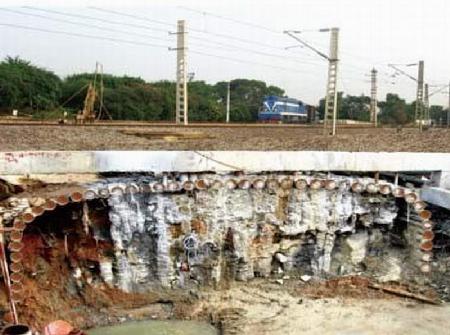 管幕施工時沿隧道軸線方向采用密排法將φ299mm的鋼管水平直線鋪設(shè)在土體里,與隧道外輪廓最小凈距25cm,并在φ299mm鋼管連接處打入φ60mm鋼花管進行管幕內(nèi)外回填注漿,對土體進行注漿加固并使φ299鋼管成為一個整體。在施工過程中確保導向鉆孔精度,然后擴孔與拉管同時完成,并及時注漿,成功控制了地面及鐵路軌面沉降,確保了鐵路正常運行及隧道施工的安全。